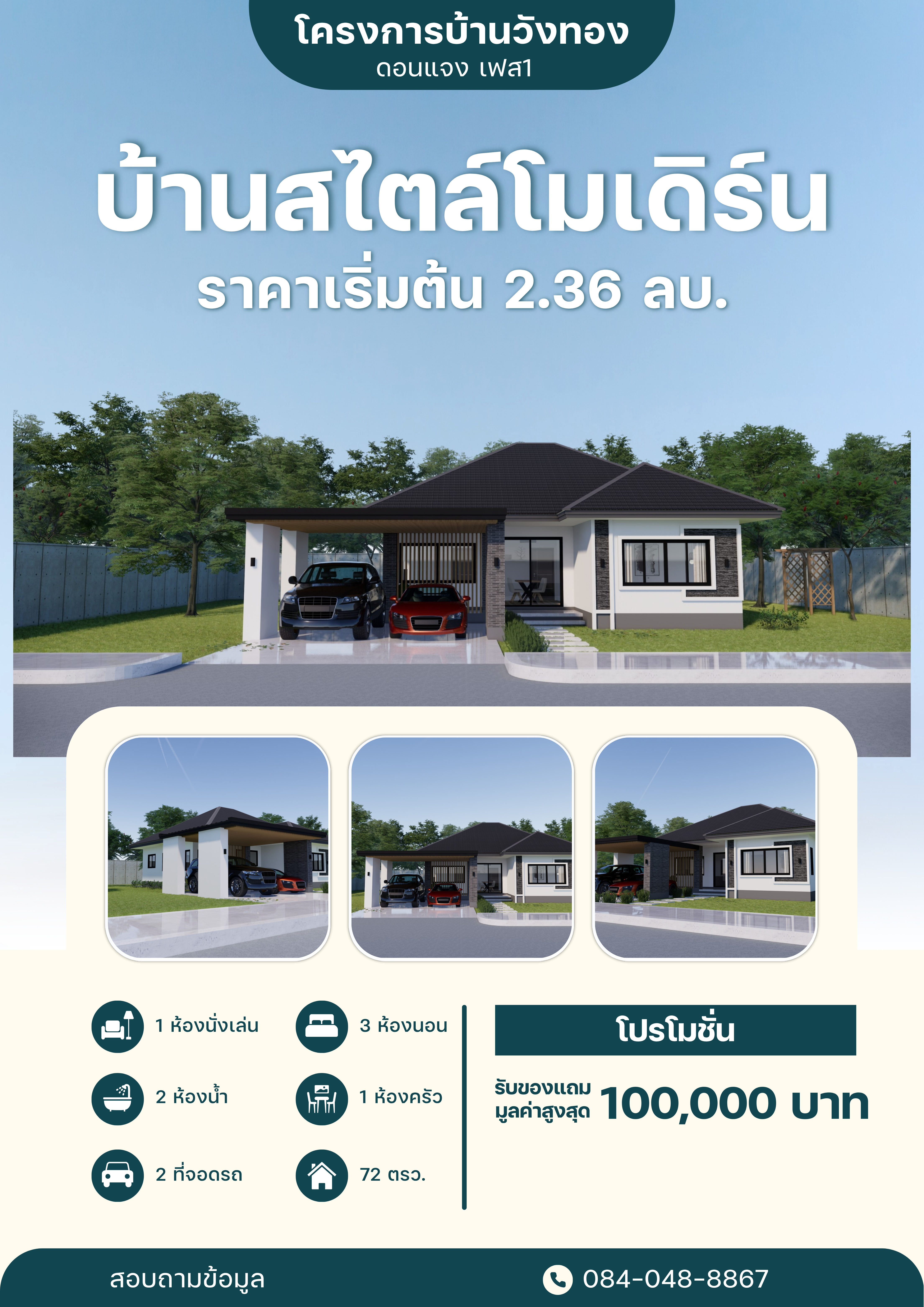 บ้านดี ชีวิตดี เริ่มต้นที่หมู่บ้านวังทอง ราคาคุ้มค่า บ้านกว้าง ฟังก์ชันครบ เนื้อที่เยอะ วัสดุมีคุณภาพ ไม่มีค่าส่วนกลางกับ 4 โครงการคุณภาพ